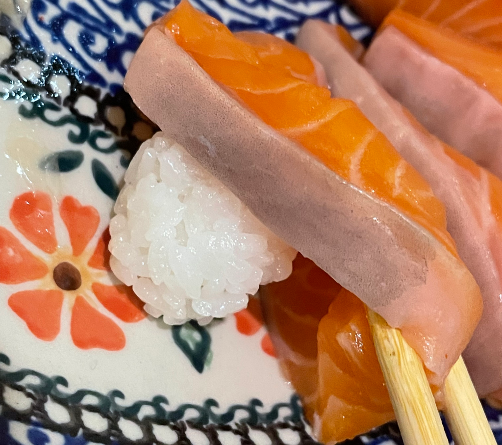 新鮮な生のサーモンを使った刺身は、かなり厚切りで、口いっぱいにサーモンの味を楽しめます。