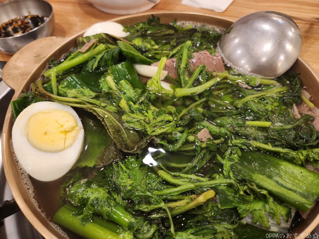 ⇧어복쟁반(オボクジェンバン)、初めはエゴマの葉や春菊に覆われて牛肉が見えなかったのですが・・・